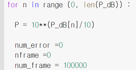 - 각 P_dB마다 SER을 계산하기 위해 for을 사용했습니다.